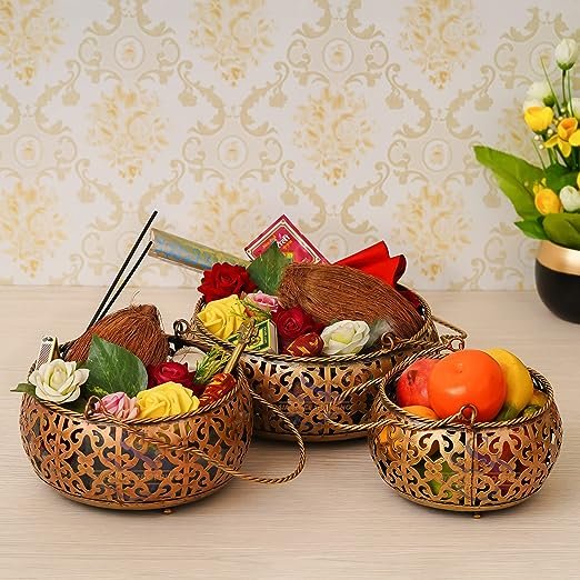 Antique Finish Beautiful Decorative Handmade Design Metal/ Iron Basket Set of 3 for Fruits Basket, Puja Basket, Flower Basket & Gift Hamper For Home Decor (SET OF THREE)Availability: 3 in stock