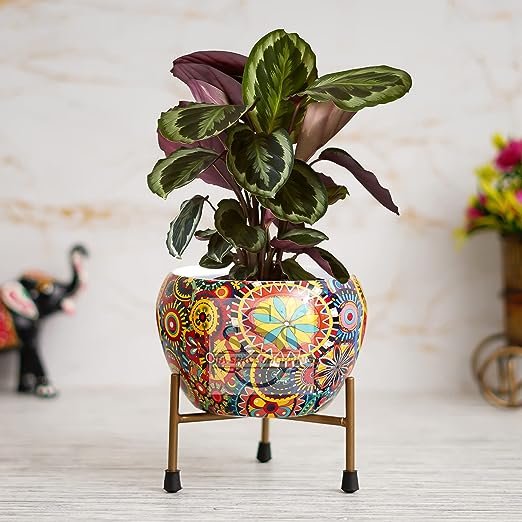 Round Metal Meena Pots with Stand-Durable Rust Free | Flower Planter for Home Garden Décor | Table Top Flower Pot | Best for Indoor & Outdoor Plantation